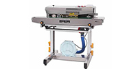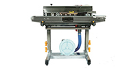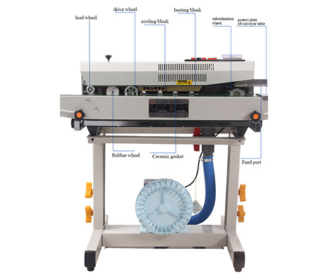 When it turns on, the electronic theronic thermal component products quantity of heat to make the Temperature and speed necessary for the sealing material through the temperature control meter and the speed Regulatorthe plastic packing bag is transmitted by the conveyer belt with its sealing part sentinto between The two running sealing braids and subjected to the extrusion of the two heaters in heating area to have the Plastic film bound after being heater, then the bag is cooled in cooling area, its sealing partrolled by the Pattern roller or the inker wheelis make out with stripes or netted veins and necessary colorlabelthe drive Part consists of sealing belt, lead belt and conveyer belt all in synchronism running driven by a motor.